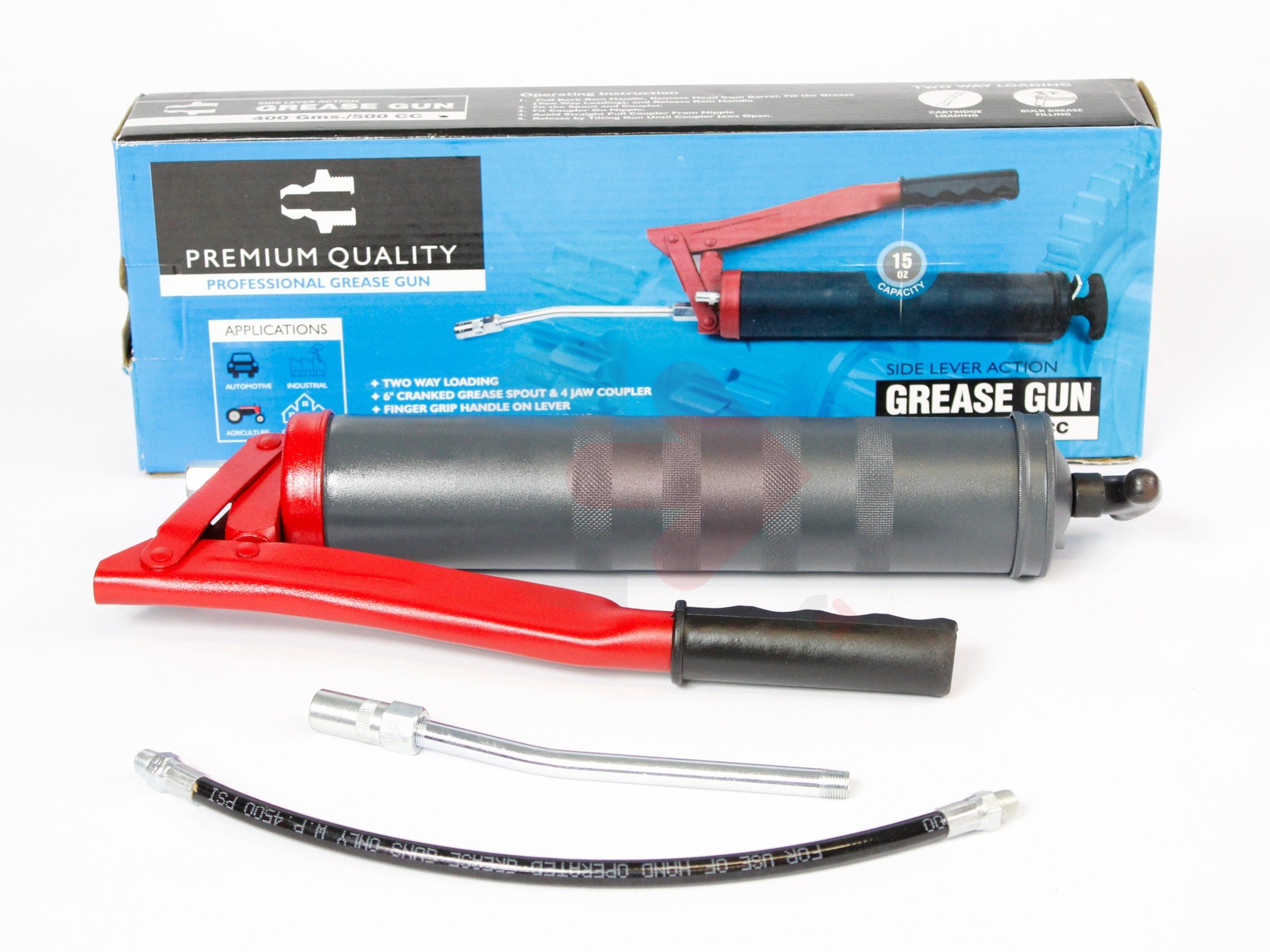 Ruční mazací pistole, používaná ve stavebních strojích následujících značek: JCB, Caterpillar, Volvo, Case, Komatsu.