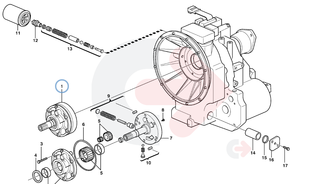 Olejové čerpadlo vytlačuje olej z převodovky vytvářením potřebného tlaku v mazacím systému. Standardní řešení v převodovkách stavebních strojů.