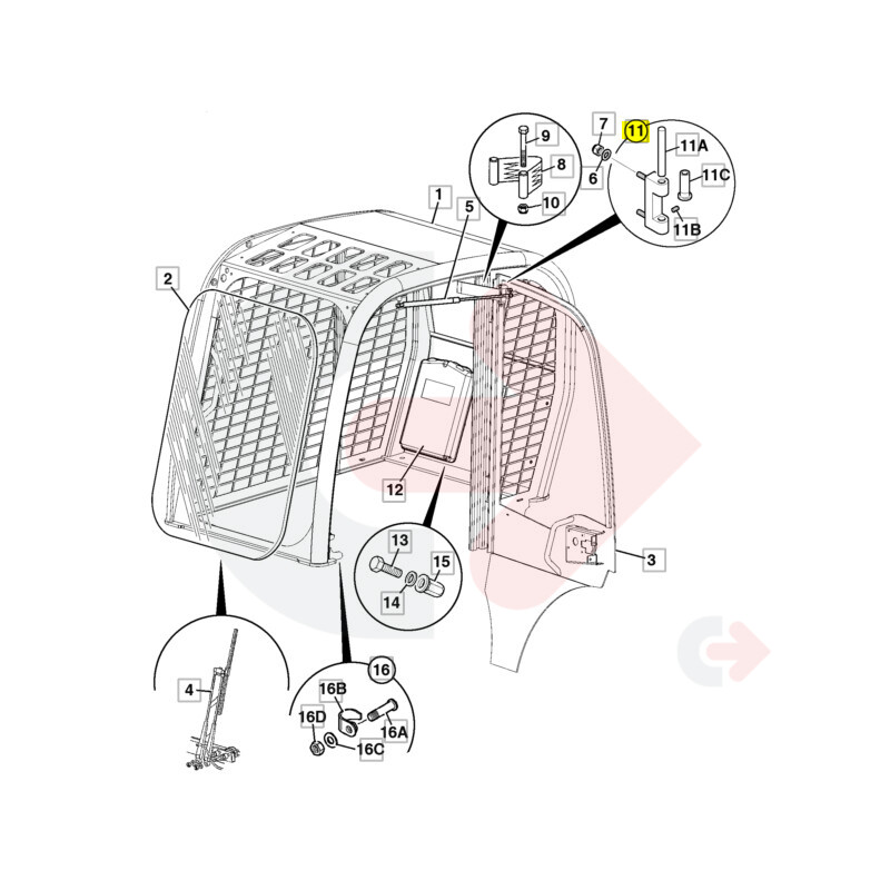 Závěs dveří používaný ve stavebních strojů JCB.