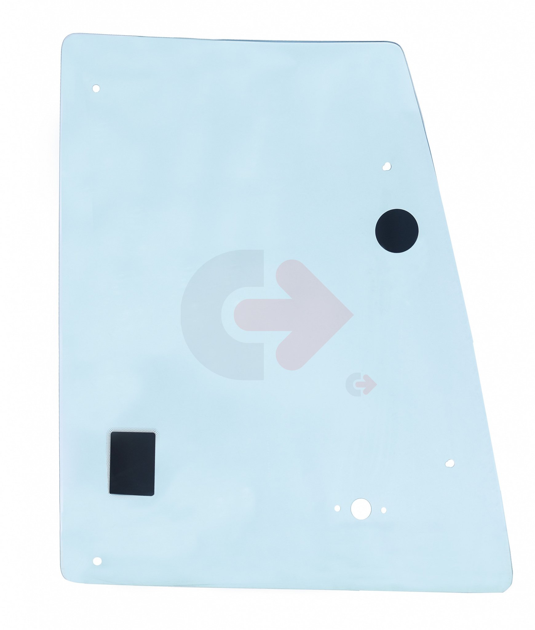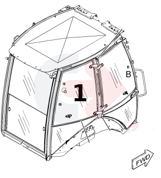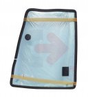 Boční sklo za dveřmi na pravé straně pro rýpadlo-nakladače CATERPILLAR.